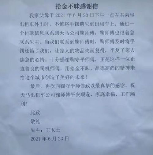 拾金不昧是中華民族的傳統(tǒng)美德,既是主流價(jià)值觀倡導(dǎo)“品德修養(yǎng)·潔身自愛”的人文瑰寶,更是華夏兒女傳承的非物質(zhì)文化遺產(chǎn)。2021年6月23號(hào),一位老人在乘坐我們泰安旅汽天馬出租公司鞠守平師傅的出租車時(shí)不慎將拿去清洗的金手鐲遺落在車上。事發(fā)后,鞠師傅聯(lián)系不上失主,馬上將乘客遺失的物品交回公司,天馬出租公司劉經(jīng)理擔(dān)心失主著急,經(jīng)過多方聯(lián)系以及泰安市交通局出租辦的幫助,終于聯(lián)系上了正在著急的老人,并將物品歸還給失主。失主感動(dòng)不已,說天馬出租的鞠師傅有一顆金子般的心,并委托朋友為鞠師傅送來了感謝信和錦旗。